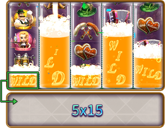 1スピン目に第1~第5リールがランダムでビールを注がれ、WILD図柄に変わります。 最大で1リール全体がWILDになる可能性があります。 揃った場合、図柄が右側へ一列ずつ移動するルールは通常ゲームと同じです。 |