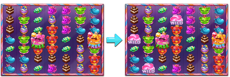 FREE GAME中には再びFREE SPINSを獲得する可能性があります。 配当方法、図柄配当率と賞金計算方法は通常ゲームと同じです。 FREE GAME中にキャンディ大放出が発動すると、任意の1〜5の図柄を マルチプライヤーマスと追加マルチプライヤーは、FREE GAMEが終了するまでリール上に固定されます。 |