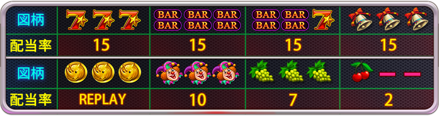 | 本配当表は通常ゲーム時の配当率です。BIG CHANCEおよびBONUS GAME中の配当率は別途計算されます。 |
