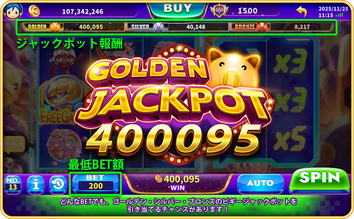 💡 ジャックポットゲームでは、Golden/Silver/Bronze のポット 🐷 がいつでも出現する可能性があります。どのスピンもランダムジャックポットのチャンス!たった一度の幸運で、展開が丸ごとひっくり返ります!大きい報酬には、それ相応の入場料が必要になります。それがこのゲーム!しかも…例えば 200金Coin で賭けて、 400,000+ を持ち帰ることだってあり得ます!こういうどんでん返しのために、ジャックポットスロットは作られています。🔑