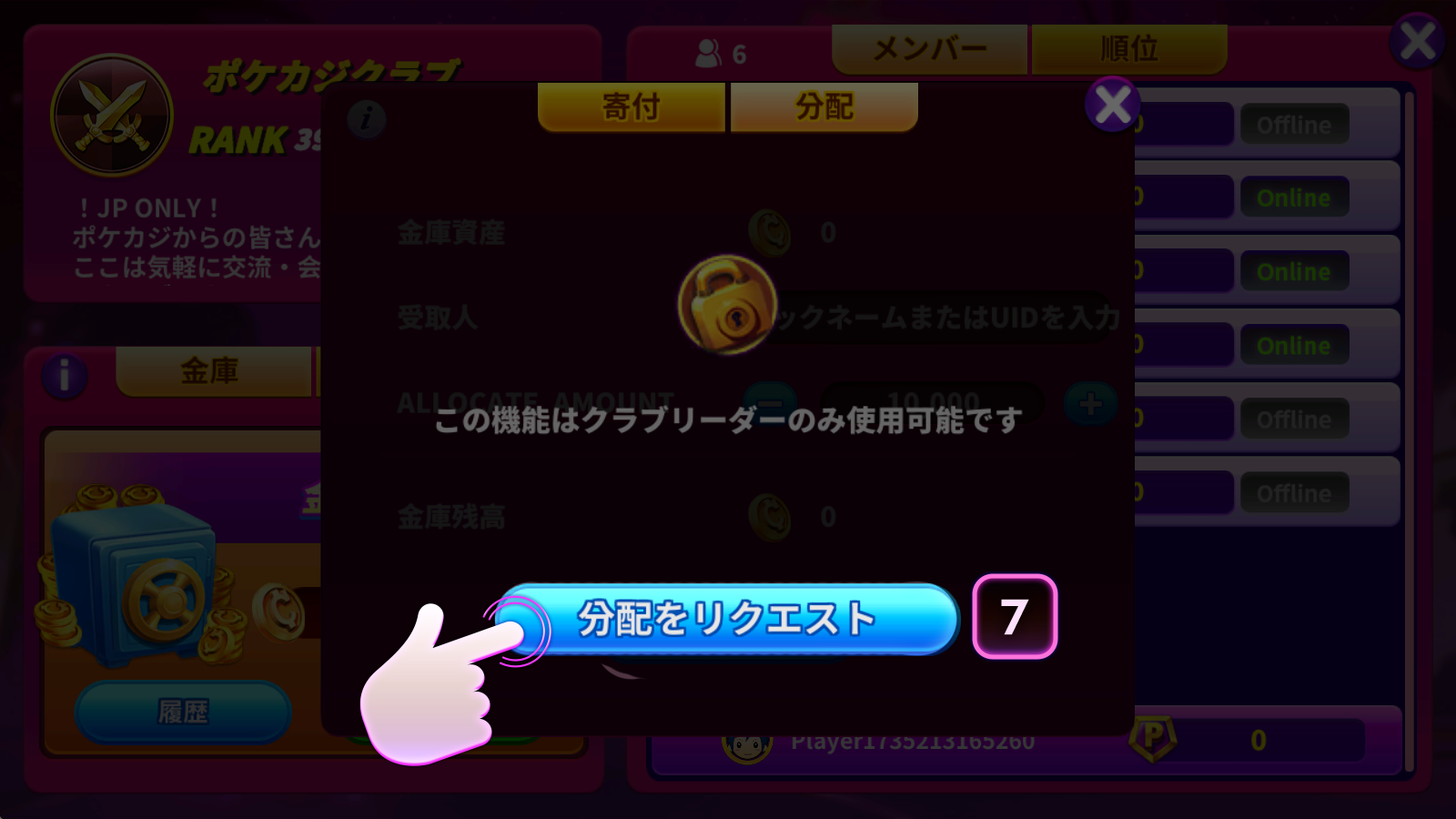 - 機能:クラブメンバーはクラブ金庫に寄付でき、クラブリーダーに資産の配分を依頼することも可能です!