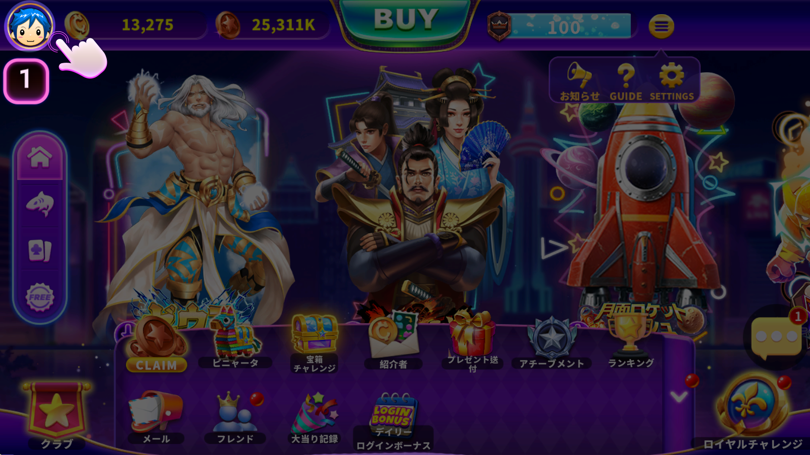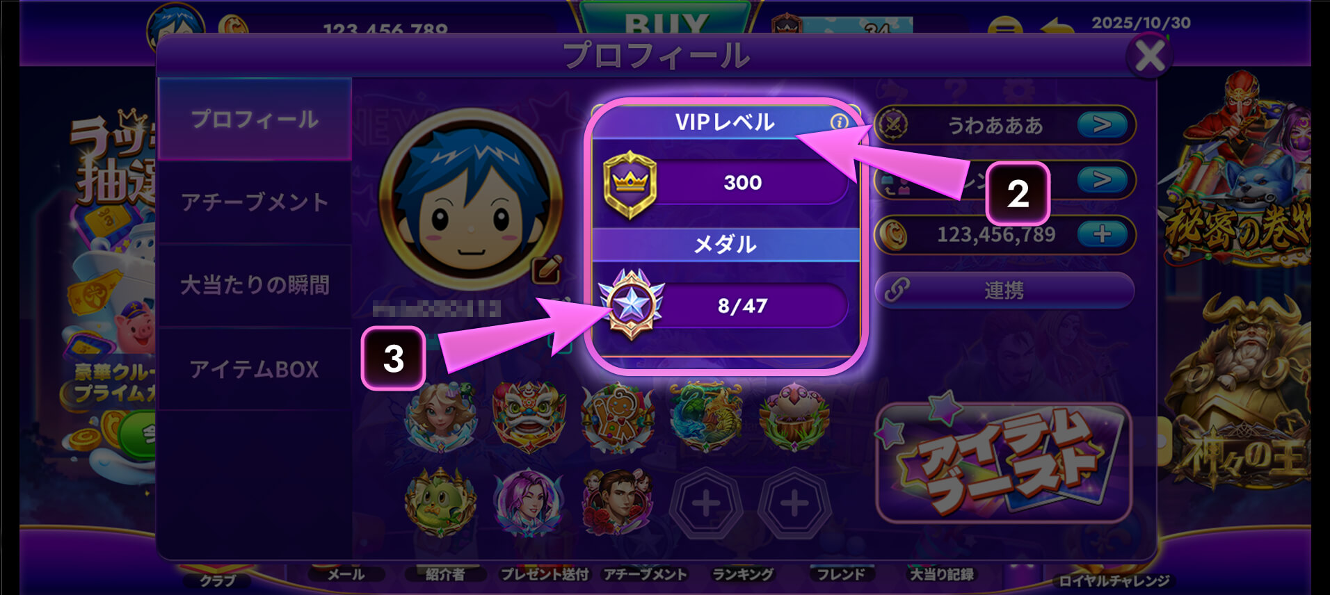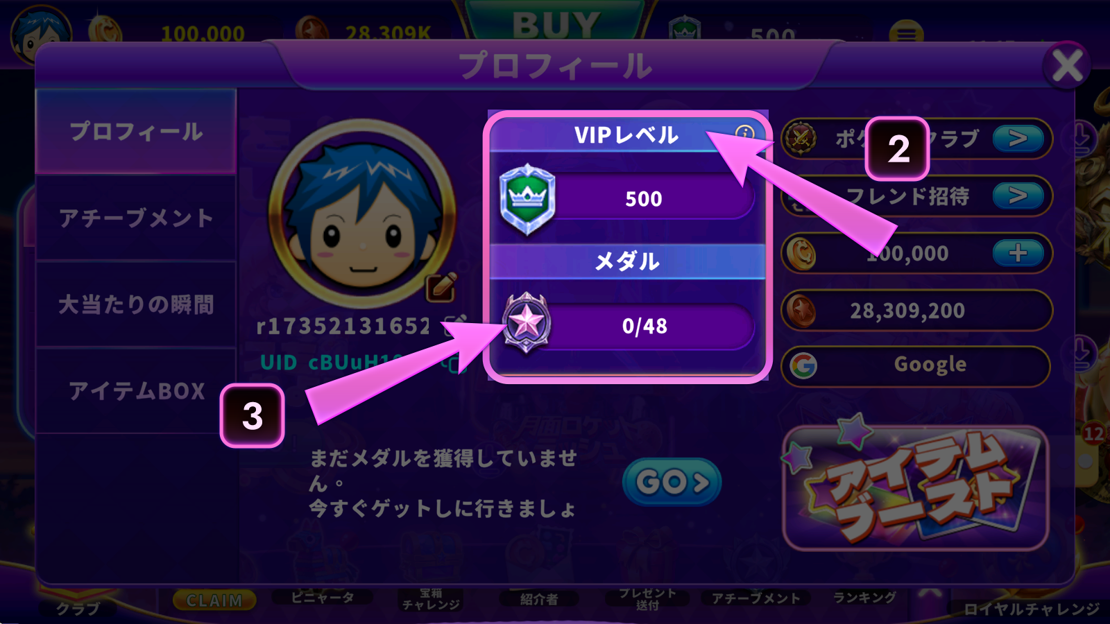 VIPレベルとメダル数は、簡単な操作ですぐに確認できます。